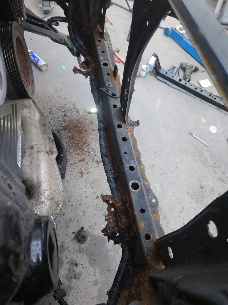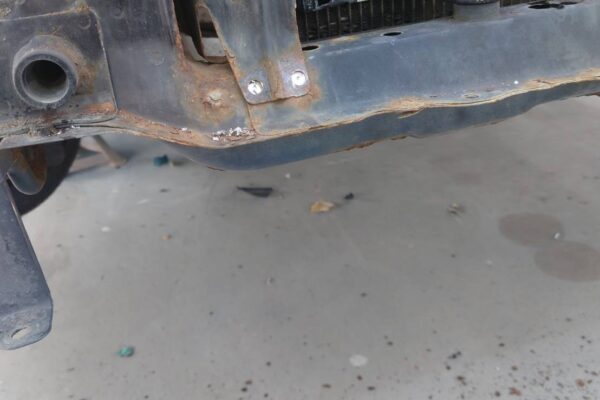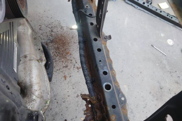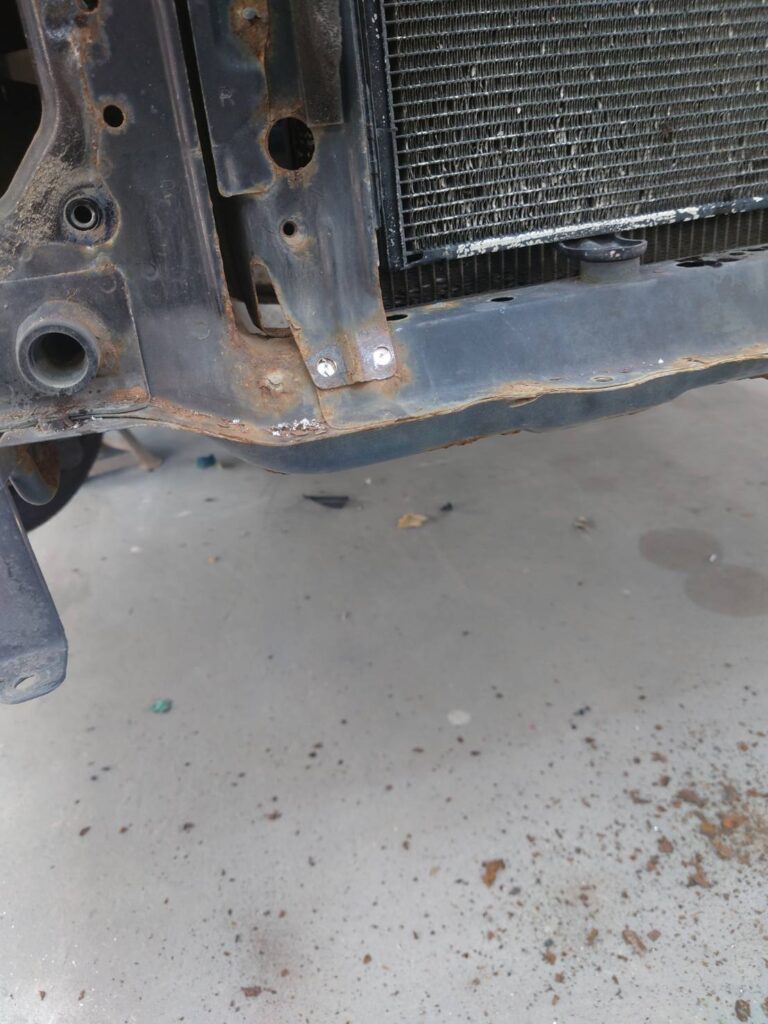 ロアサポートは、ラジエーターやコンデンサーを支える非常に重要な骨格の一部です。ここがサビて崩れてしまうと、最悪の場合ラジエーターが脱落し、オーバーヒートを起こして走行不能になるリスクがあります。