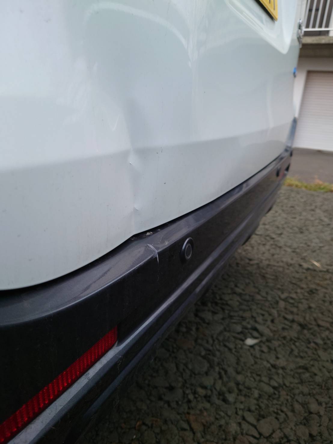 追突の衝撃でバックドア(リアゲート)が大きくひしゃげ、リアバンパーも破損。ゲートが半ドア状態から動かなくなっており、雨漏りや防犯面でも一刻を争う状況でした。