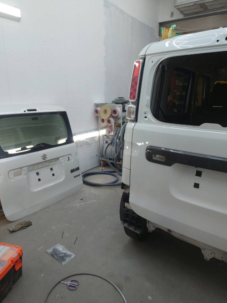 バックドアのような「大きな面積のパーツ」は、安易に交換して終わりではありません。特に軽自動車はボディの歪みが波及しやすいため、新しいゲートをただ付けるだけでは、隙間(チリ)が合わなかったり、後に錆の原因になったりします。