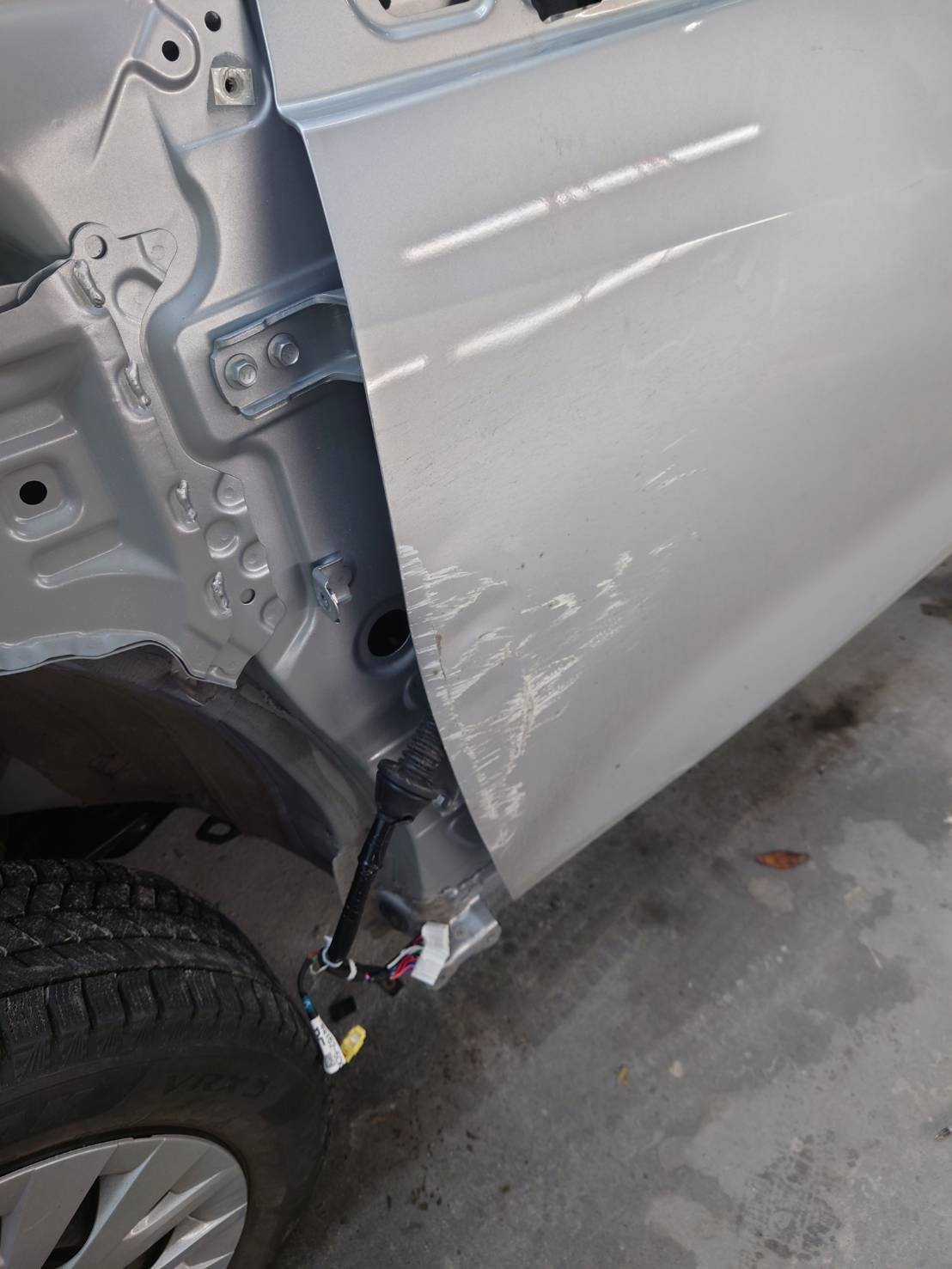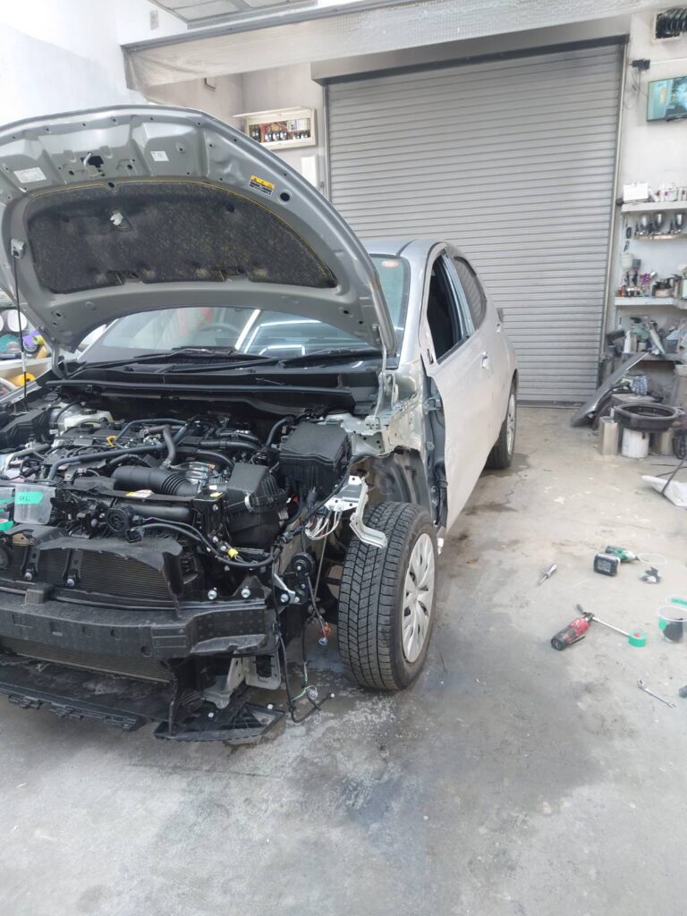 北広島市のオーナー様より、ヤリスの事故修理をご相談いただきました。フロントバンパーからフェンダーにかけて大きなヘコミと擦り傷があり、内部のブラケットにも歪みが生じている状態でした。